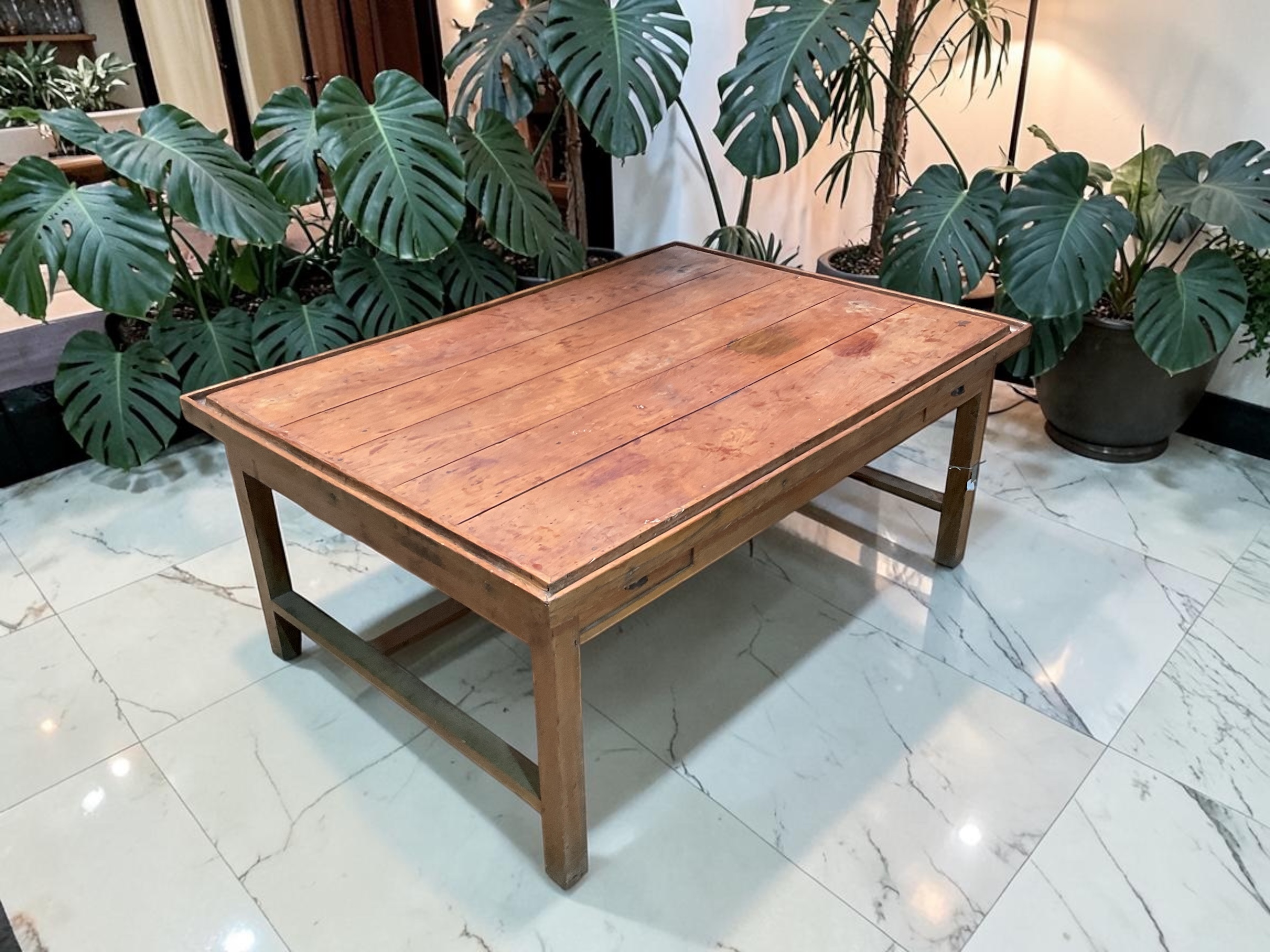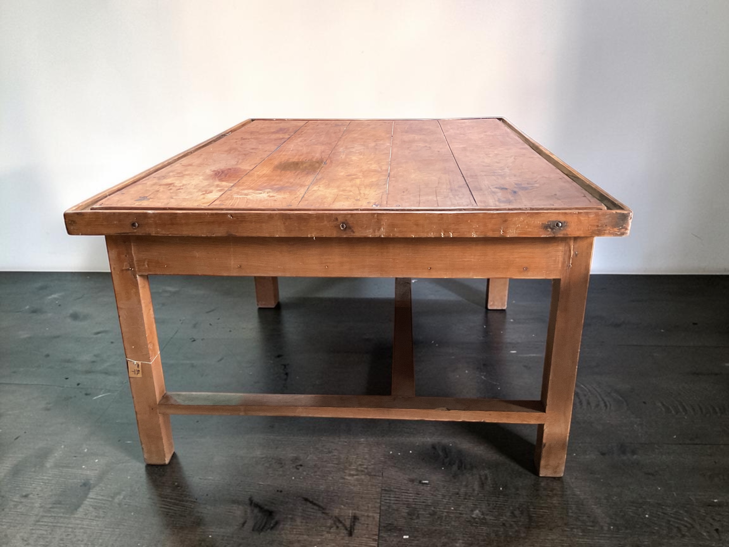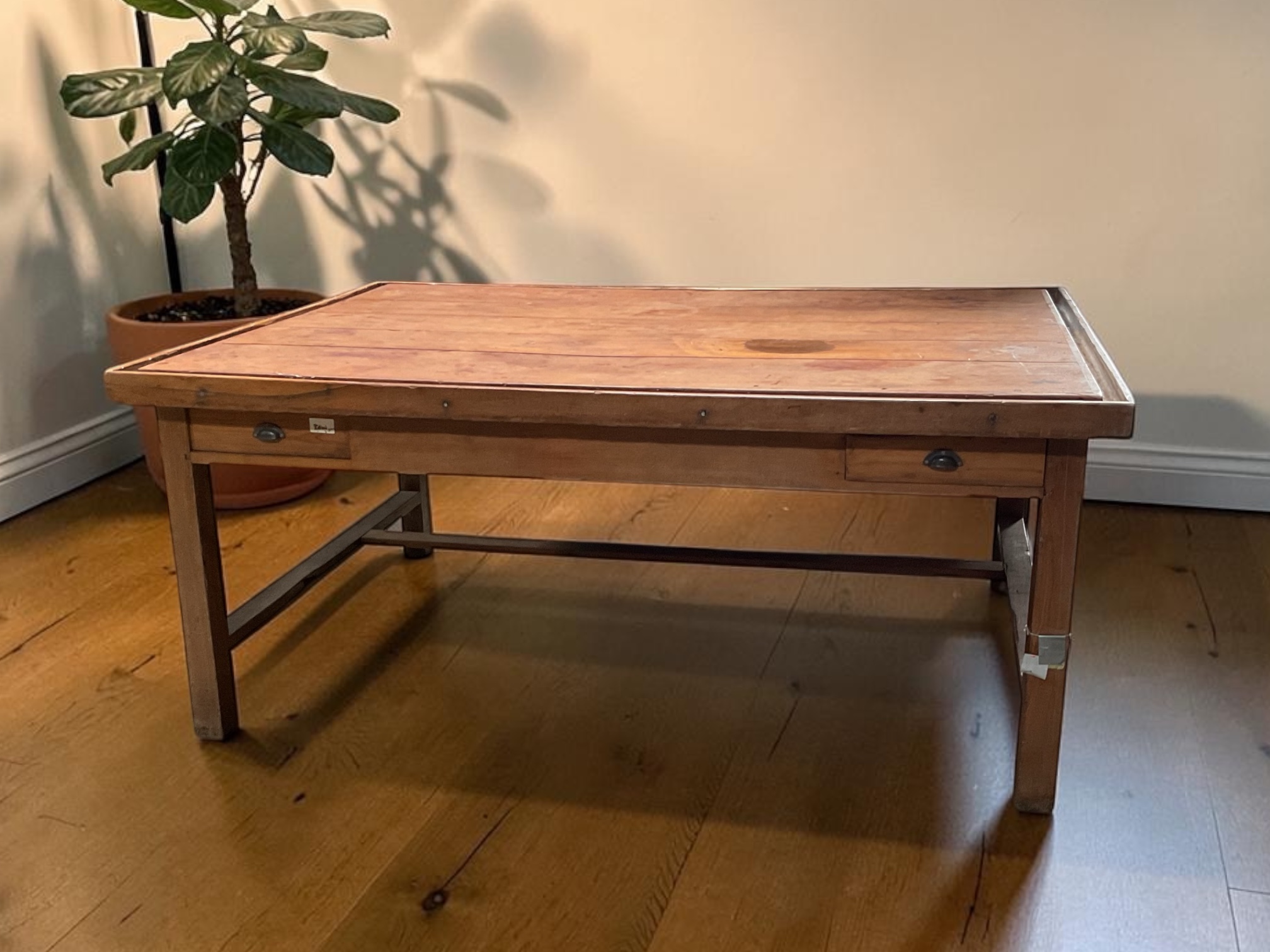 Großer Tisch aus Holz mit zwei kleinen Schubladen und stabiler Rahmenkonstruktion. Die natürliche Holzmaserung, die schlichte Form und die sichtbare Patina verleihen dem Tisch einen authentischen Vintage-Charakter.