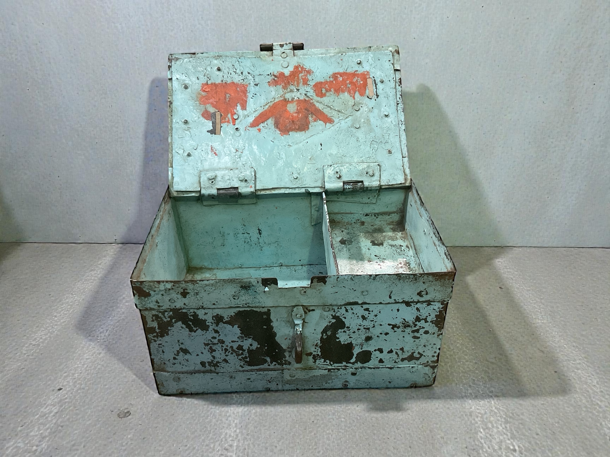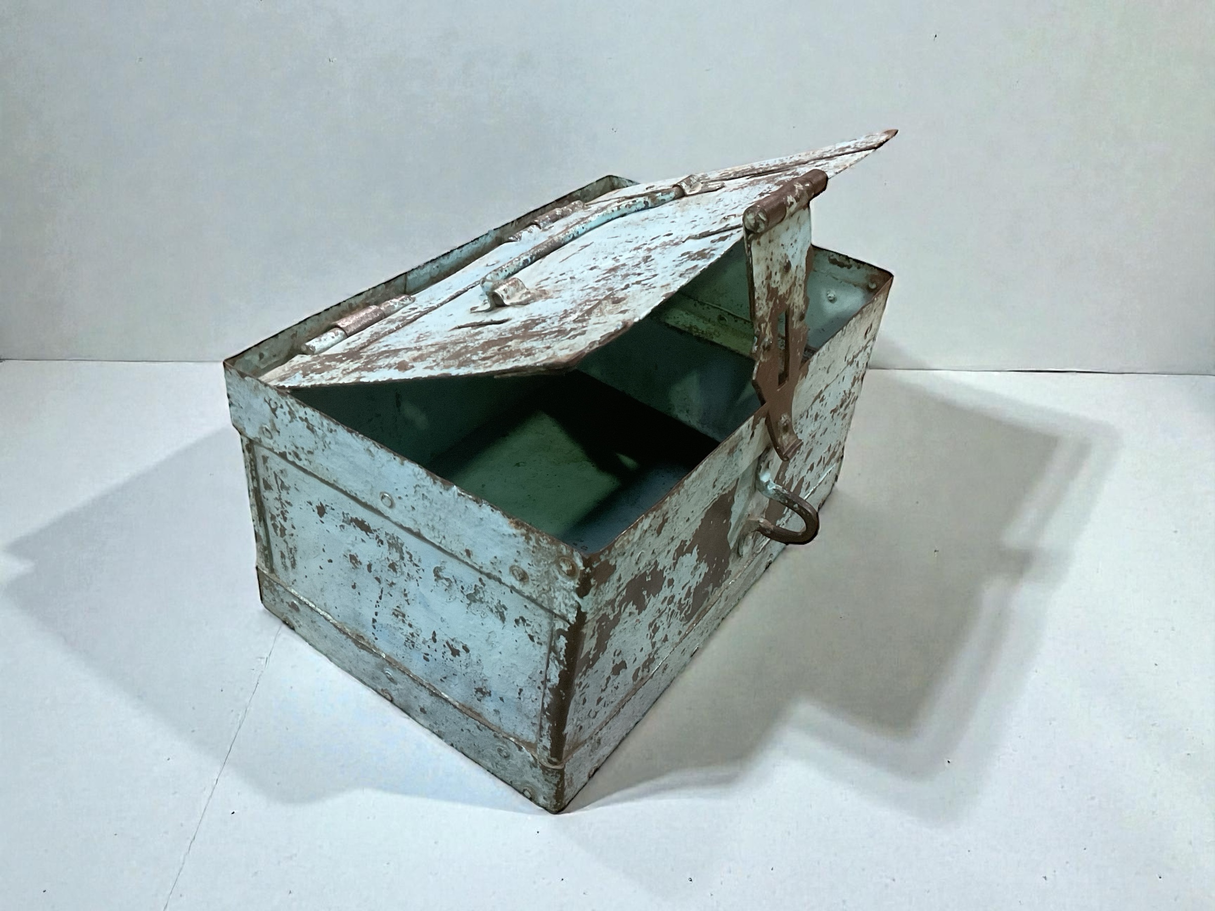 Hellblaue Eisenbox im Shabby Chic Look – Original Indische Vintage Kassa mit Schlossvorrichtung