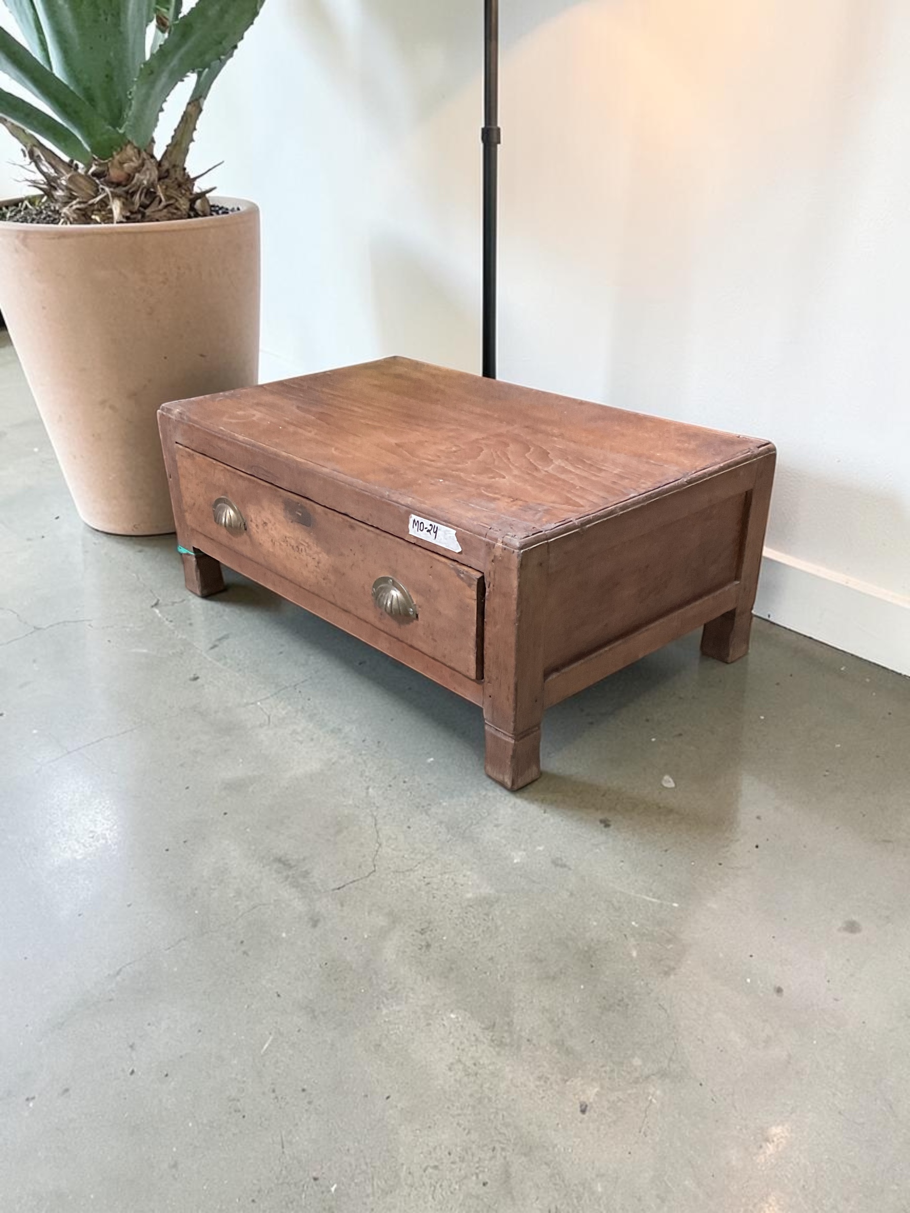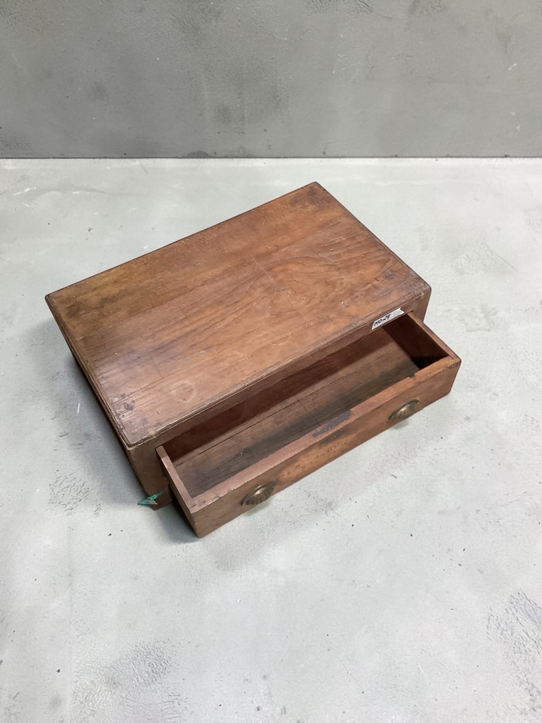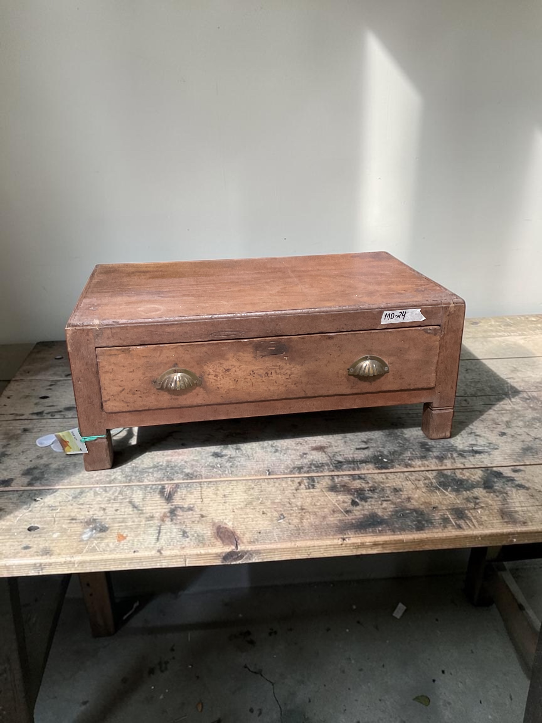 Kompaktes Beistellmöbel aus Holz mit einer breiten Schublade und zwei dekorativen Metallgriffen. Die schlichte Form, die warme Holzmaserung und die sichtbare Patina verleihen dem Möbelstück einen authentischen Vintage-Charakter.