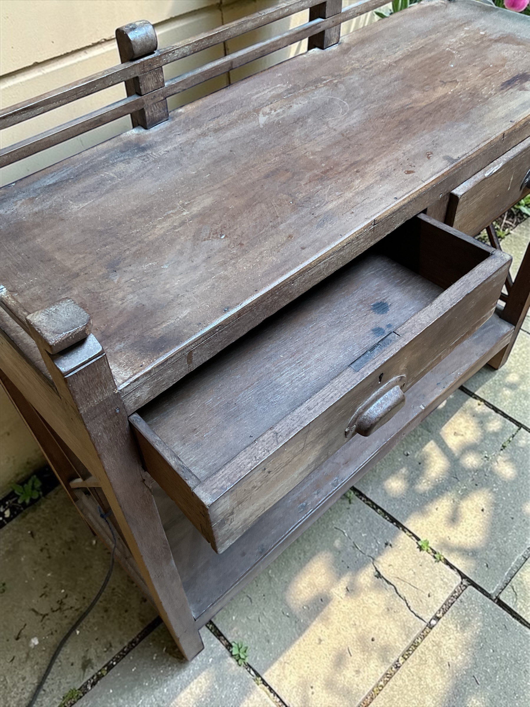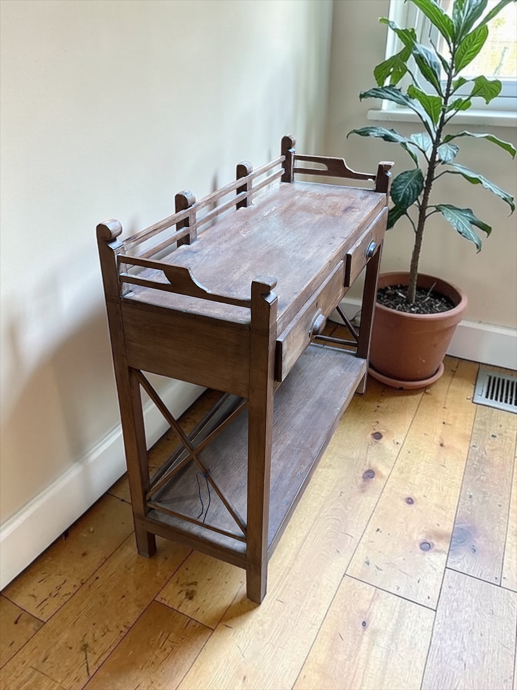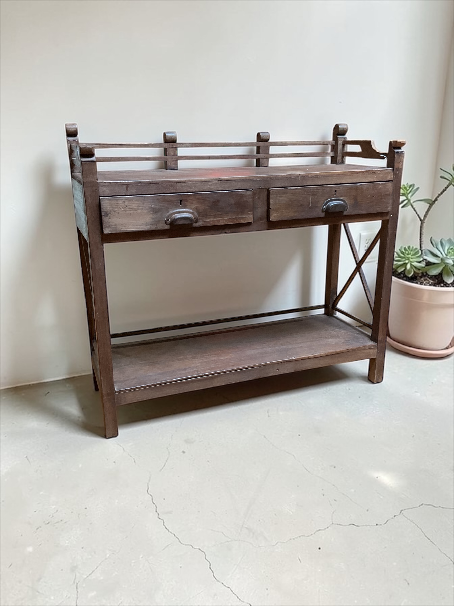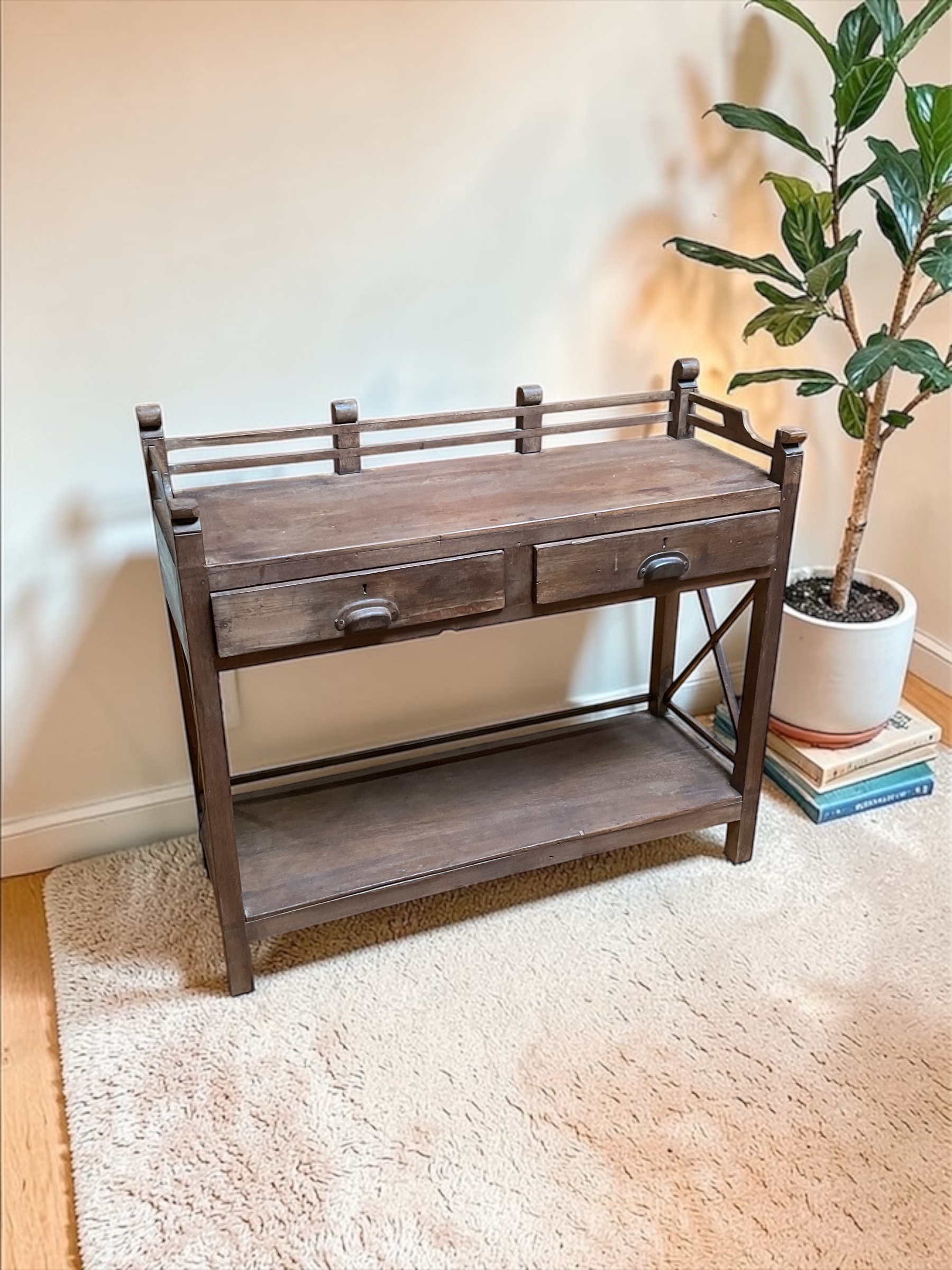 Schöner Konsolentisch aus Holz mit zwei praktischen Schubladen und zusätzlicher Ablagefläche im unteren Bereich. Die schlichte, elegante Form wird durch die dekorative Rücklehne und die seitlichen Kreuzstreben ergänzt. Die natürliche Holzstruktur und leichte Gebrauchsspuren verleihen dem Möbelstück einen authentischen Vintage-Charakter.