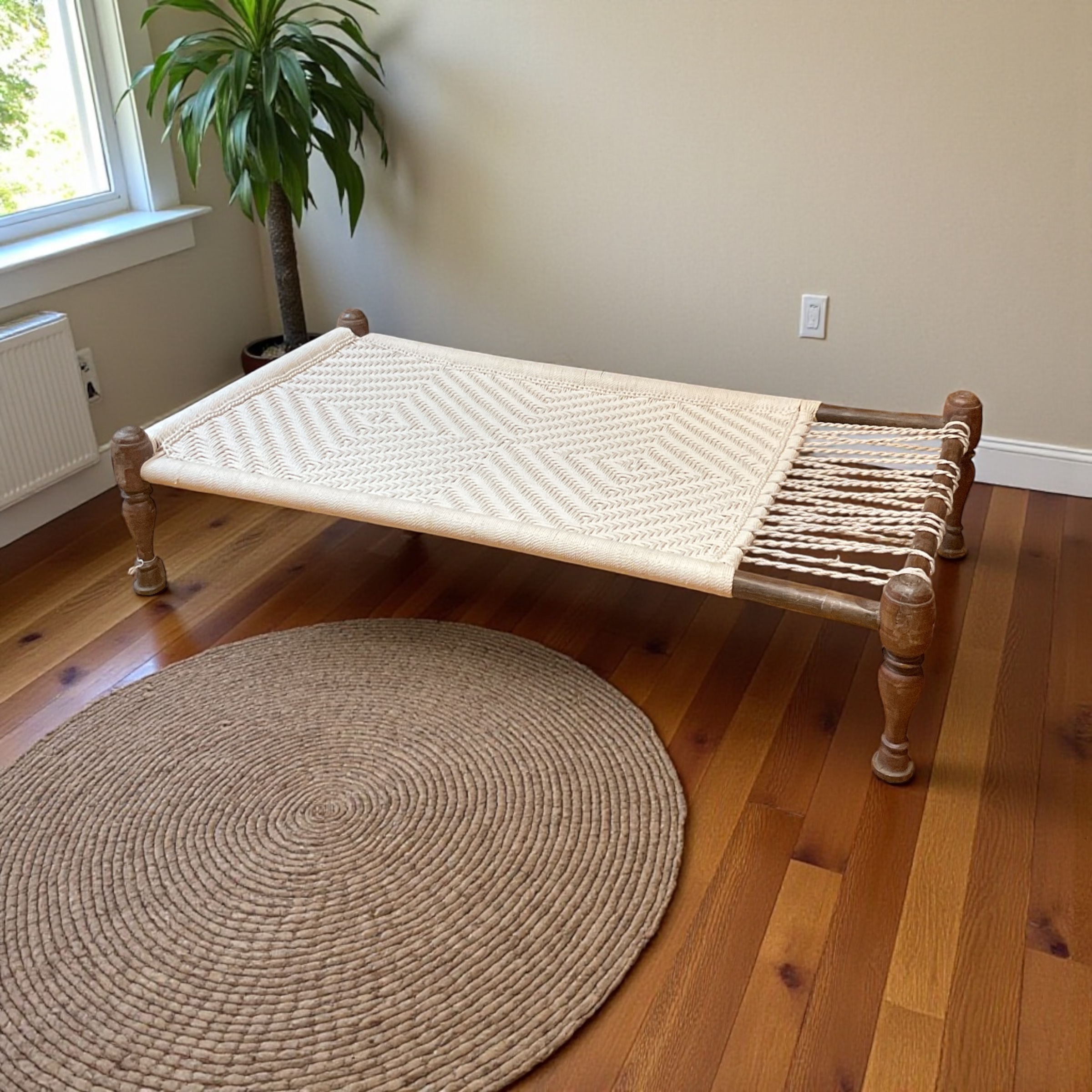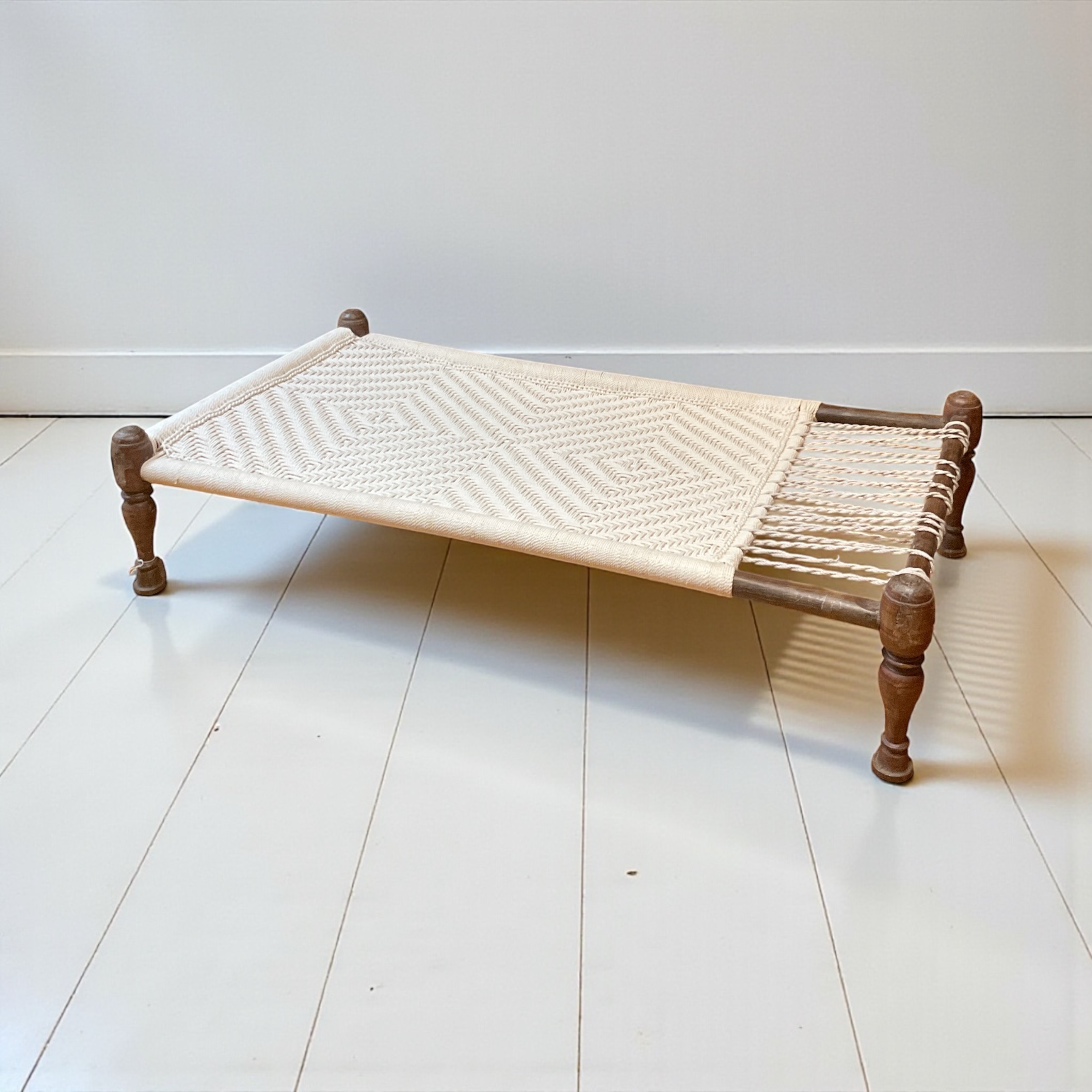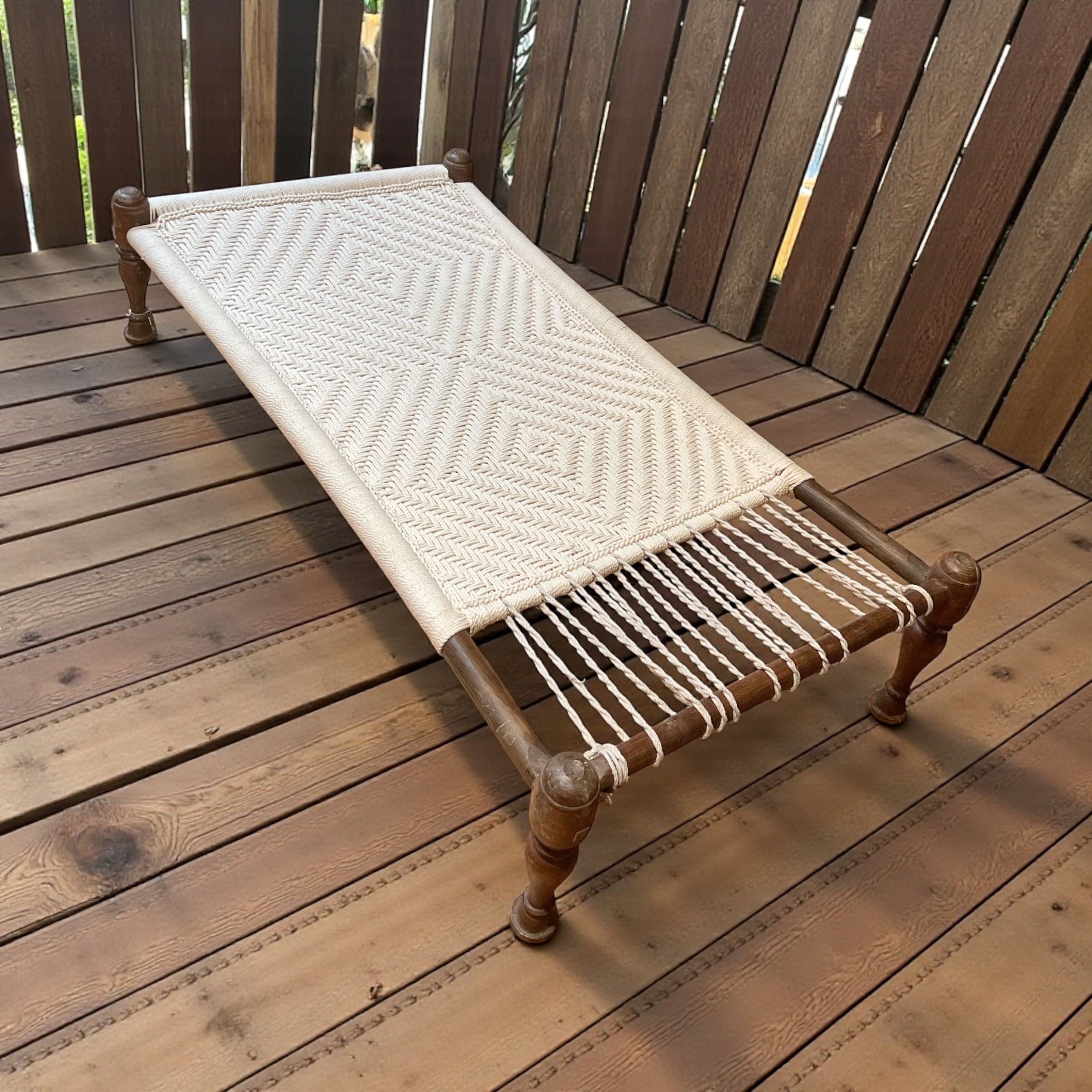 Indisches Charpai Bett / Liege aus traditioneller Handwerksarbeit. Diese alte Technik der Knüpferei wird von erfahrenen Handwerkern ausgeführt. Jedes Charpai Bett hat eine einzigartige handgewebte Liegefläche. Das Gewebe besteht aus natürlichen, fest geflochtenen Baumwollschnüren. Das Charpai Bett findet seinen Platz in Schlafzimmer, Wohnzimmer, Diele, Balkon sowie Garten. Es besticht durch seinen einfachen aber besonderen Stil.