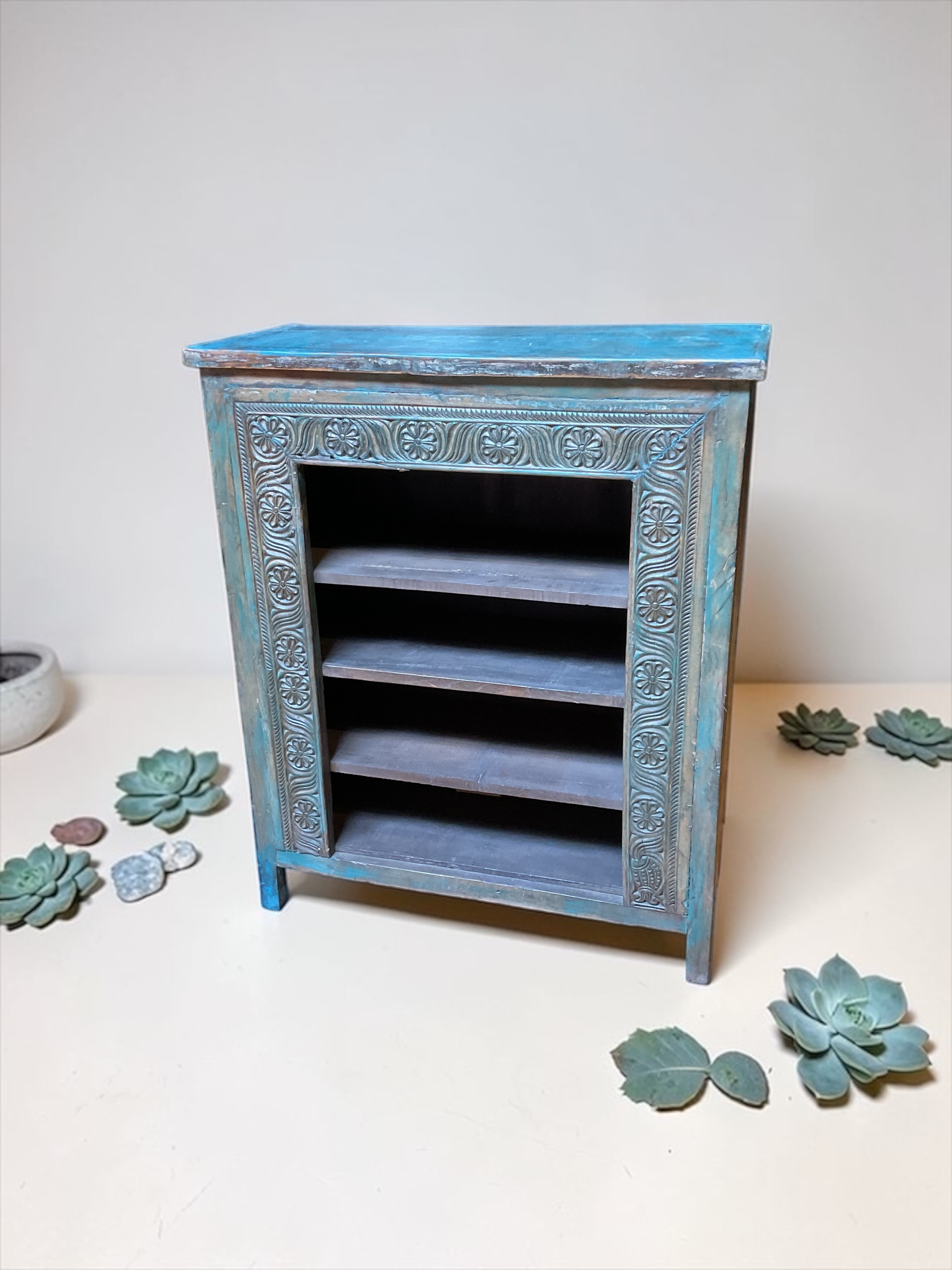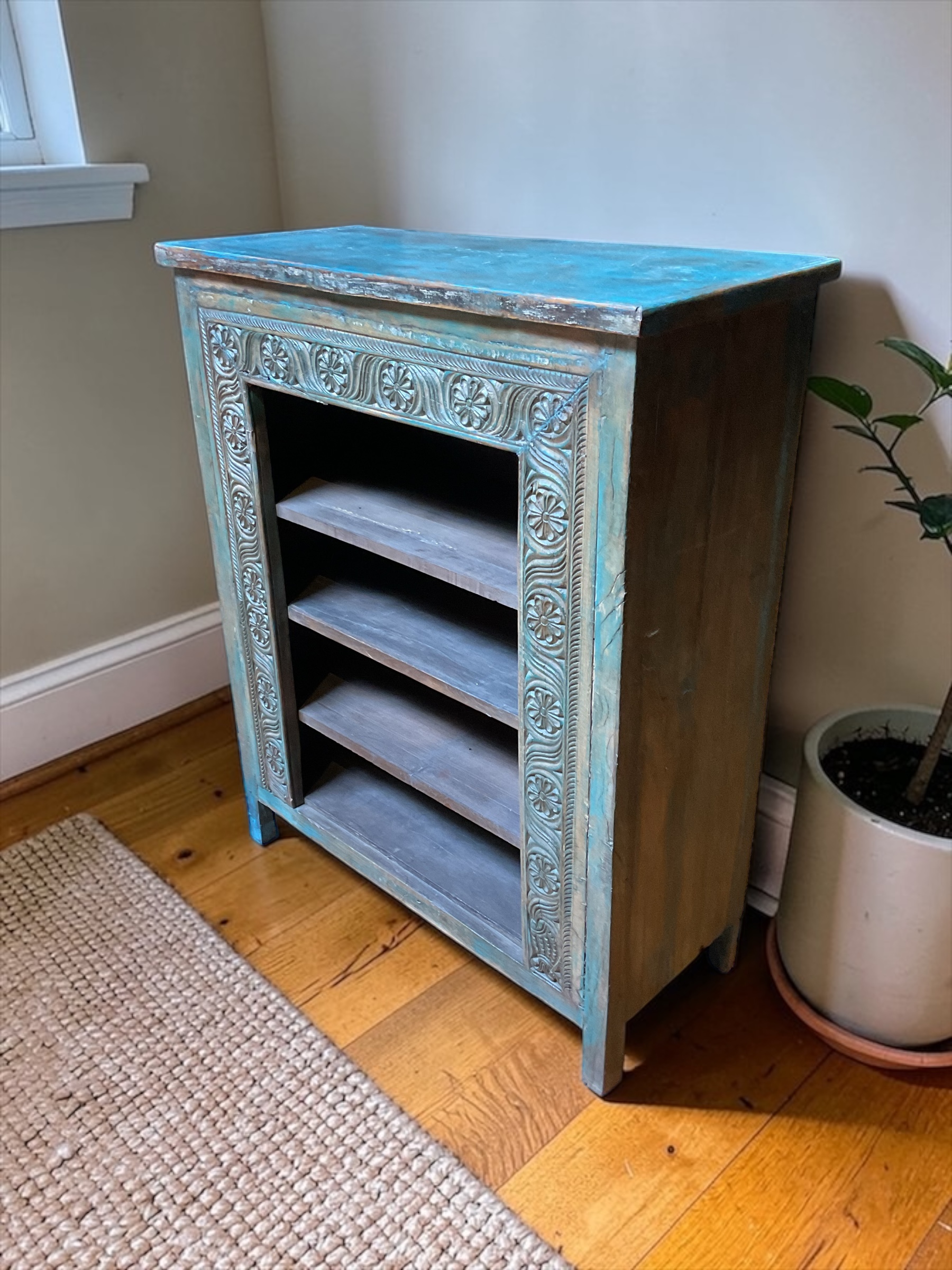 Außergewöhnliches Holzregal mit kunstvoll geschnitztem Rahmen und dekorativen floralen Ornamenten. Die türkisfarbene Oberfläche mit sichtbarer Patina verleiht dem Möbelstück einen besonders authentischen Vintage- und Ethno-Charakter. Die offenen Ablageflächen bieten praktischen Stauraum für Bücher, Dekoration oder Alltagsgegenstände.