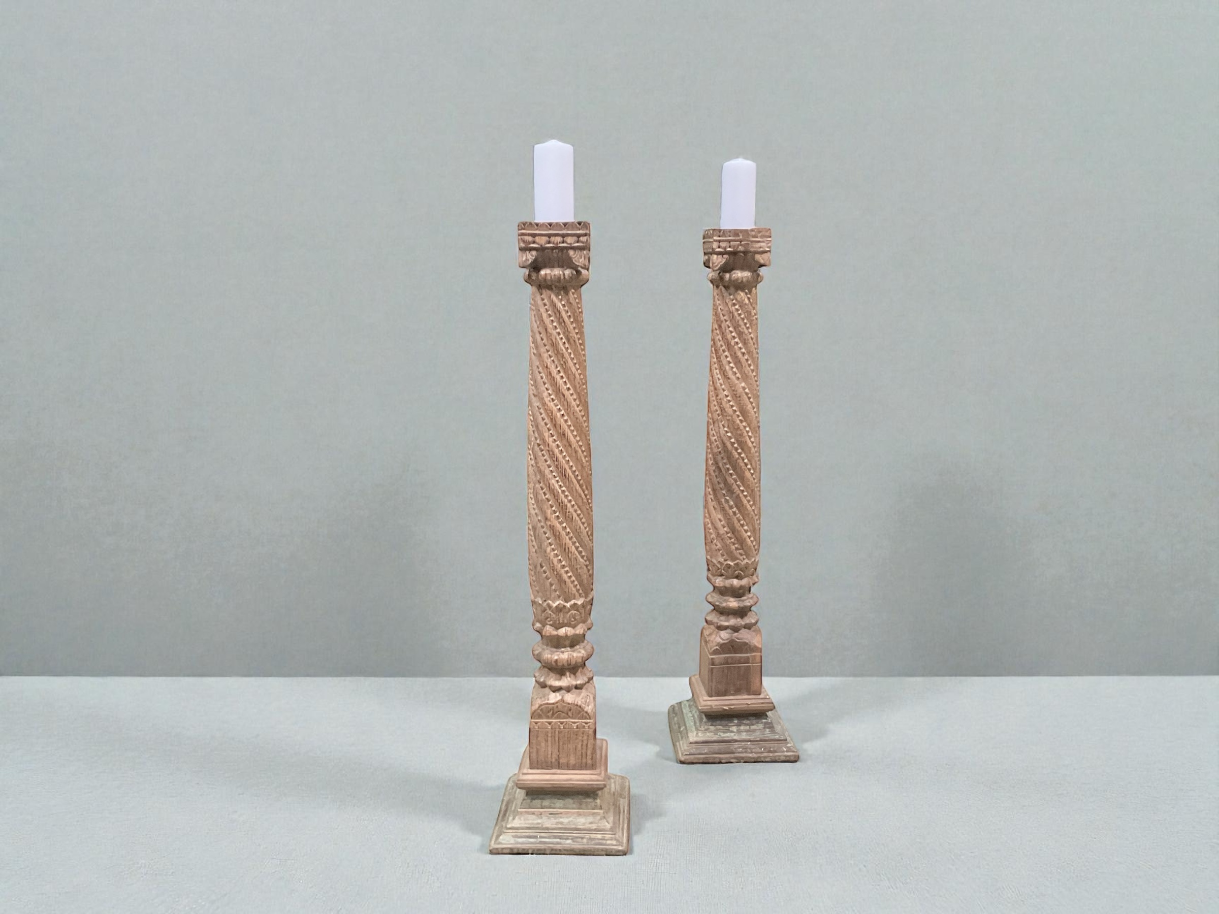 Dieser handgeschnitzte Kerzenständer aus hochwertigem Vollholz ist ein wahres Meisterwerk der indischen Kunstfertigkeit. Mit viel Liebe zum Detail wurde er in Indien von erfahrenen Handwerkern gefertigt, die ihre Kunst seit Jahrhunderten verfeinern. Der Sockel des Kerzenständers ist mit einer edlen grünen Patina versehen, die ihm eine besondere Vintage-Optik verleiht und jedes Stück zu einem einzigartigen Unikat macht.