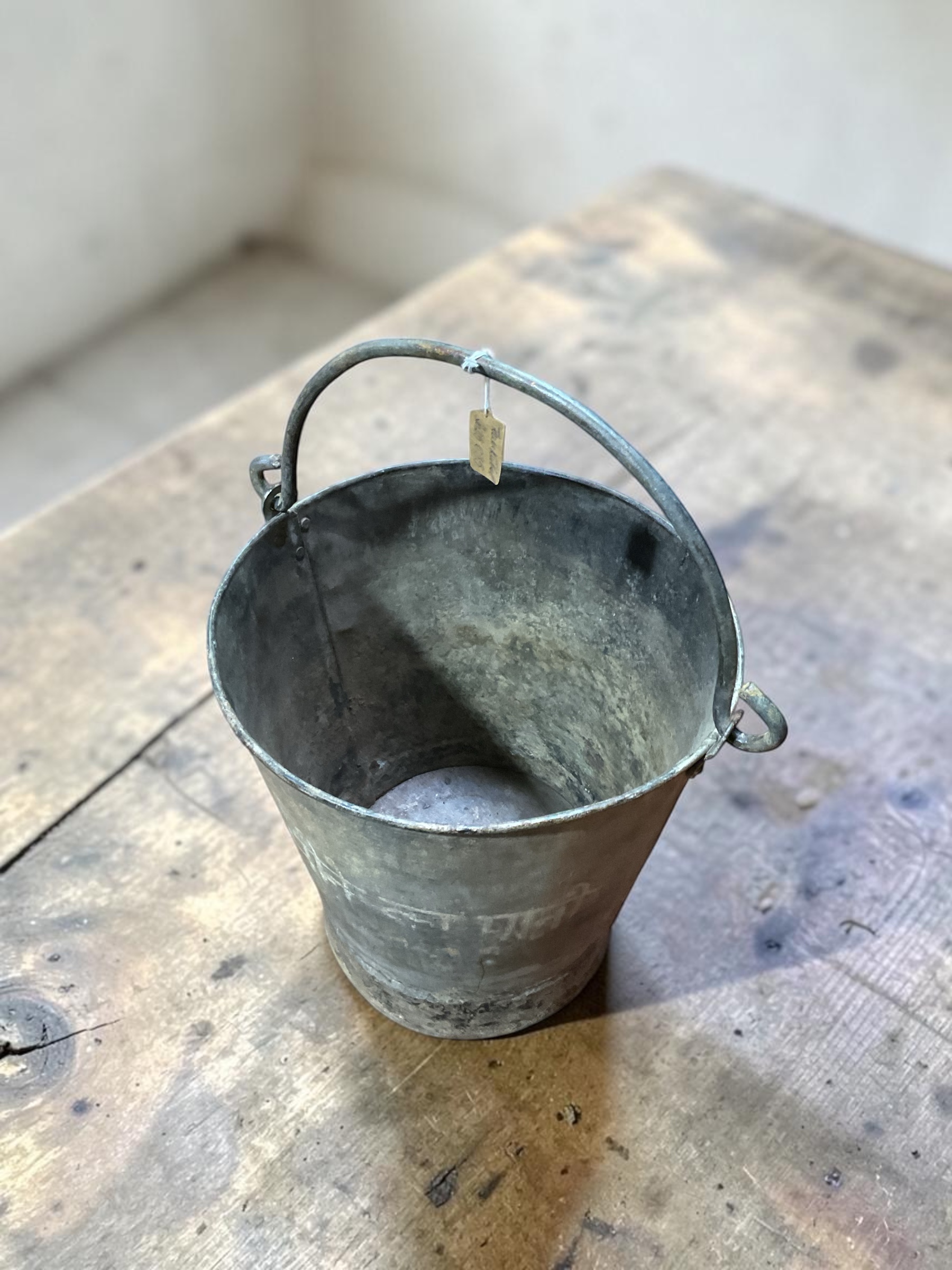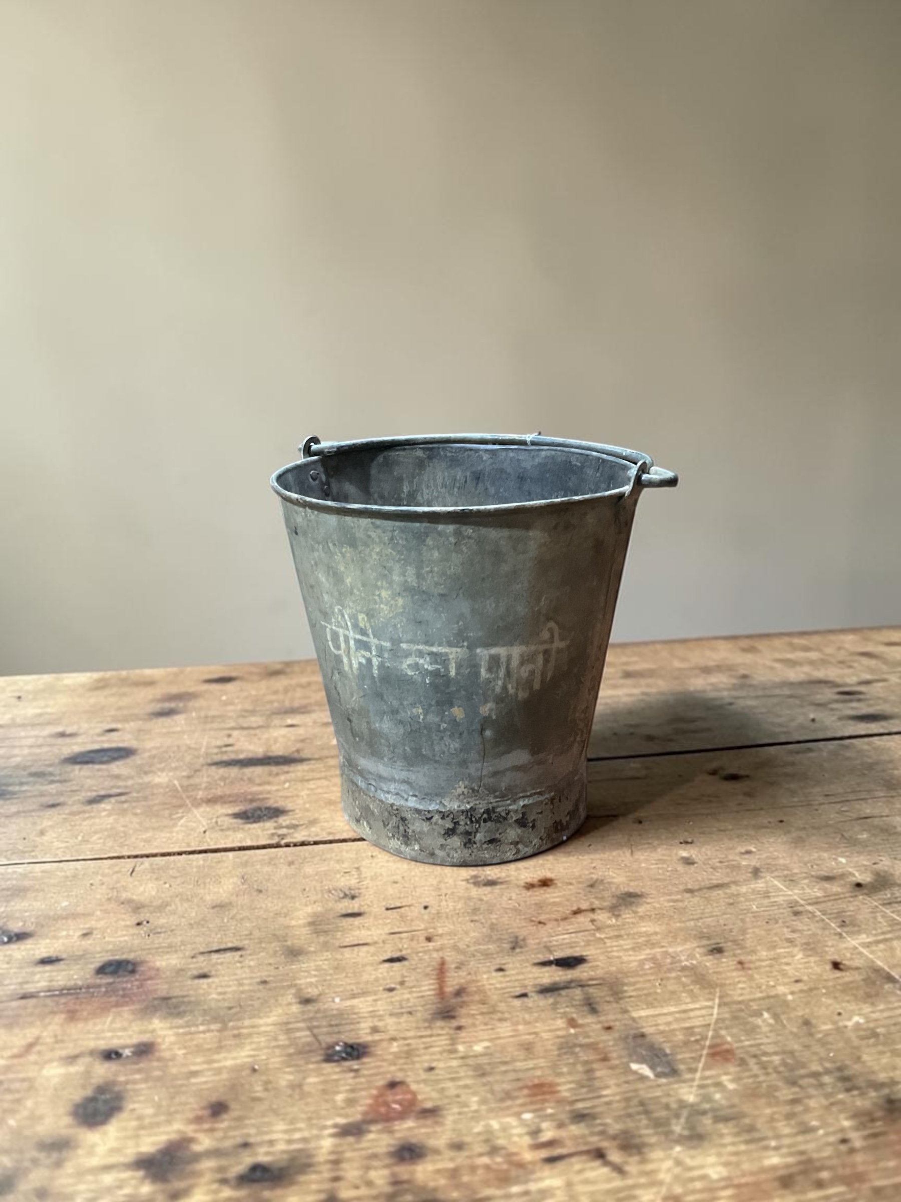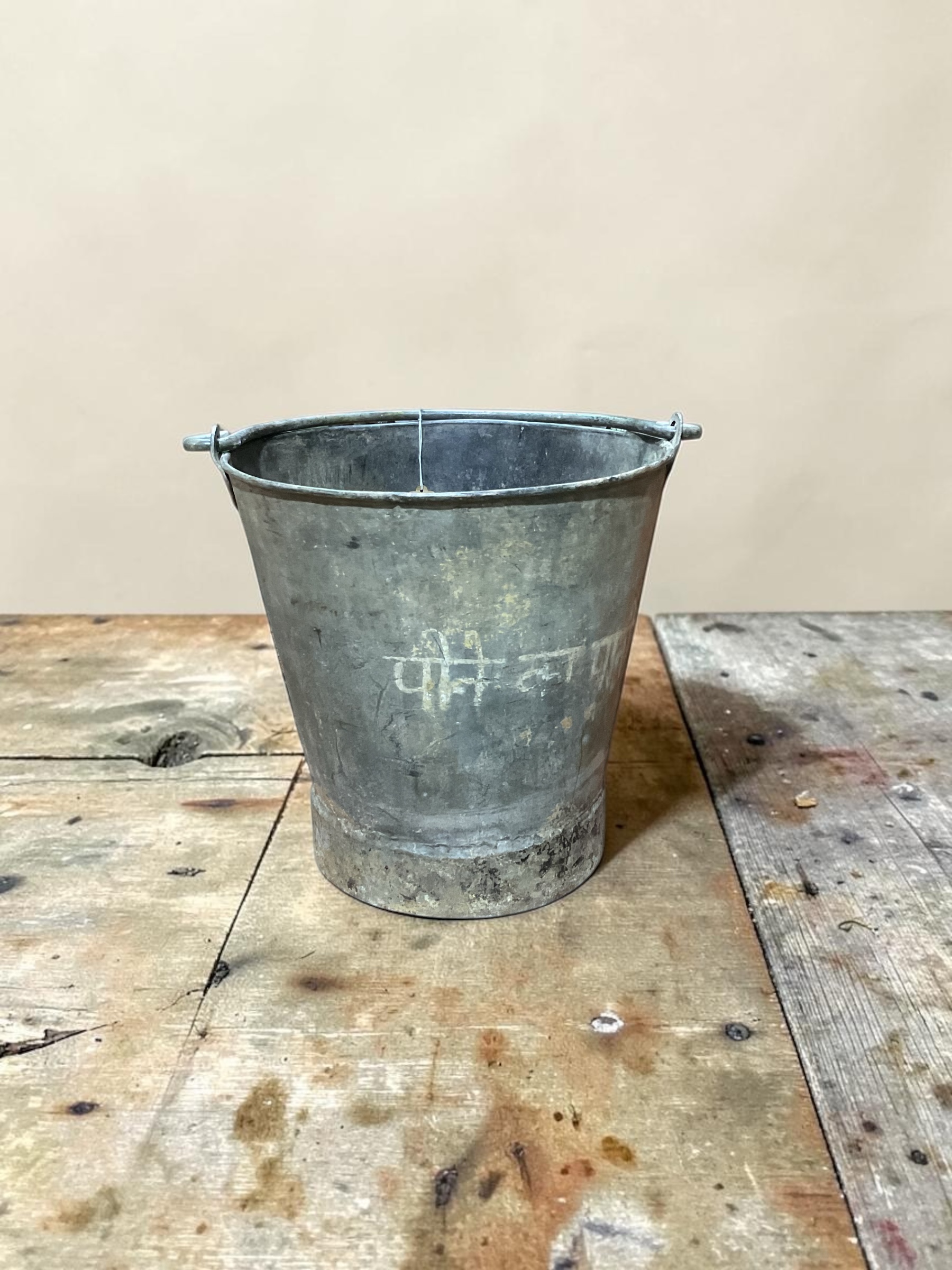 Dekorativer Eimer aus Metall mit Henkel und seitlichen Halterungen. Die schöne Patina, Gebrauchsspuren und die rustikale Oberfläche verleihen dem Stück einen authentischen Vintage-Charakter.