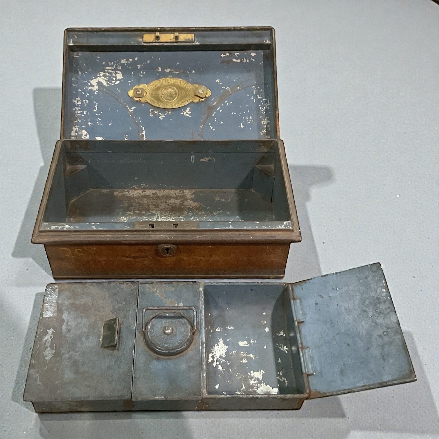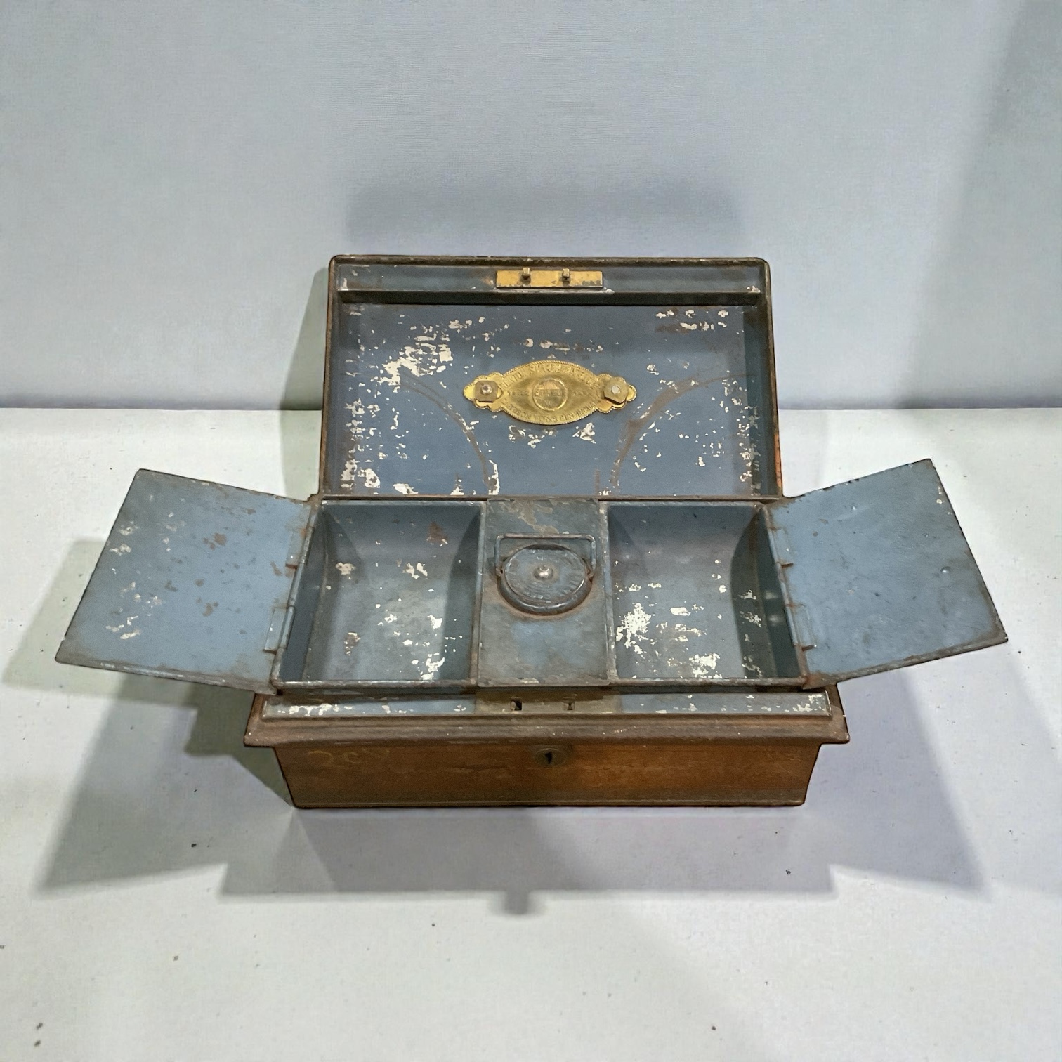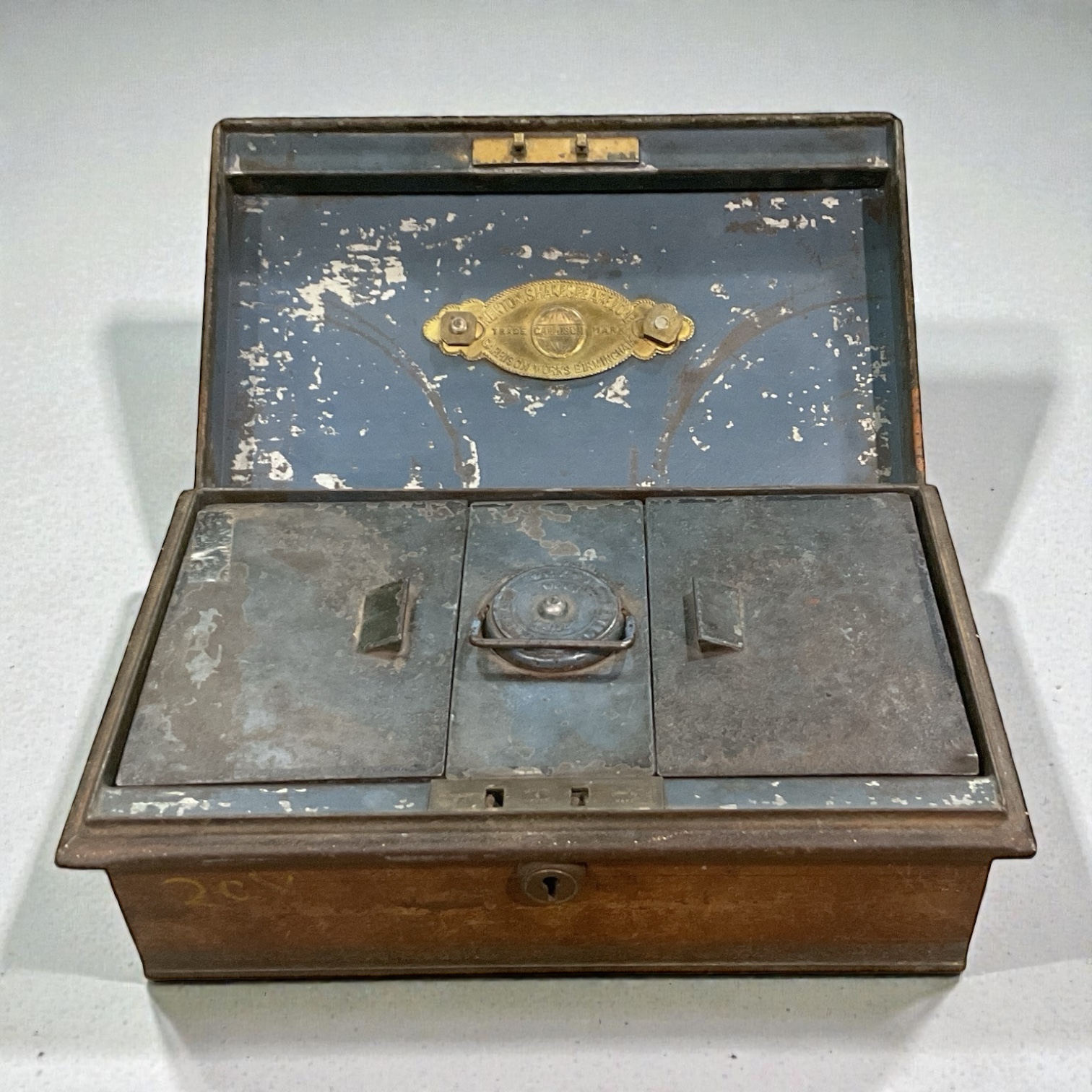 Diese antike Kassa von Newton Shakespeare & Co. ist ein echtes Sammlerstück im britischen Kolonialstil. Mit rostbraunem Äußeren, messingfarbenen Beschlägen und einem edlen, blauen Innenraum bietet sie sowohl Funktionalität als auch Charme. Der Einsatz für Kleingeld und die historische Handwerkskunst machen sie zu einem einzigartigen Highlight für Sammler und Liebhaber des Vintage-Stils.