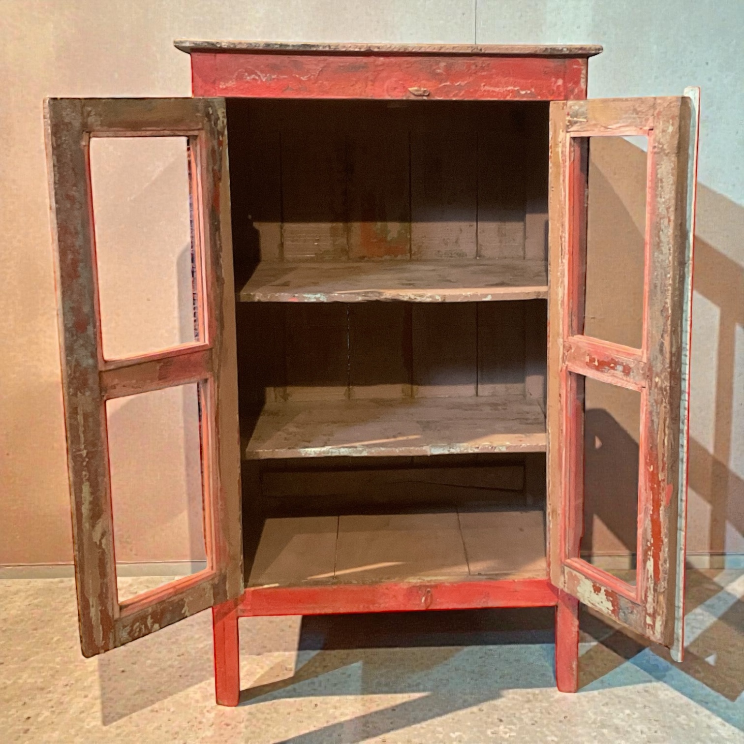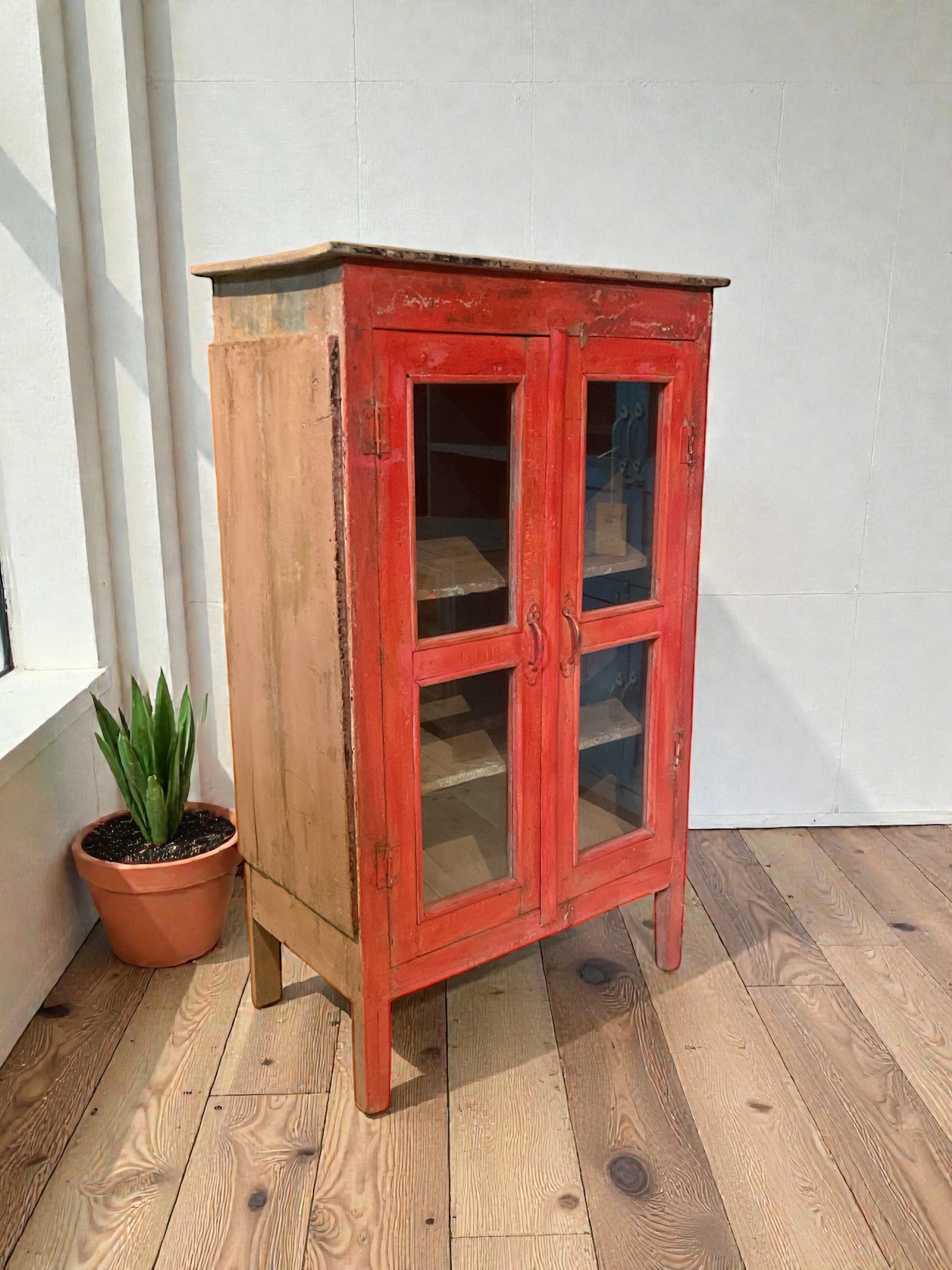 Diese stilvolle rote Vitrine im Vintage-Look verleiht jedem Raum einen besonderen Charme. Die Vorderseite erstrahlt in einem kräftigen Rot, das durch die natürliche Patina eine einzigartige, antike Ausstrahlung erhält. Die Vitrine verfügt über zwei Türen mit je einem Glasfeld, die für eine elegante Sicht auf den Inhalt sorgen. Im Inneren finden sich drei braune Fächer, die ausreichend Stauraum für Ihre Lieblingsstücke bieten. Die Innenseite der Vitrine ist ebenfalls in braun gehalten und fügt sich harmonisch in das Gesamtbild ein. Ideal für Liebhaber von Vintage-Möbeln, die nach einem Blickfang mit Geschichte suchen.