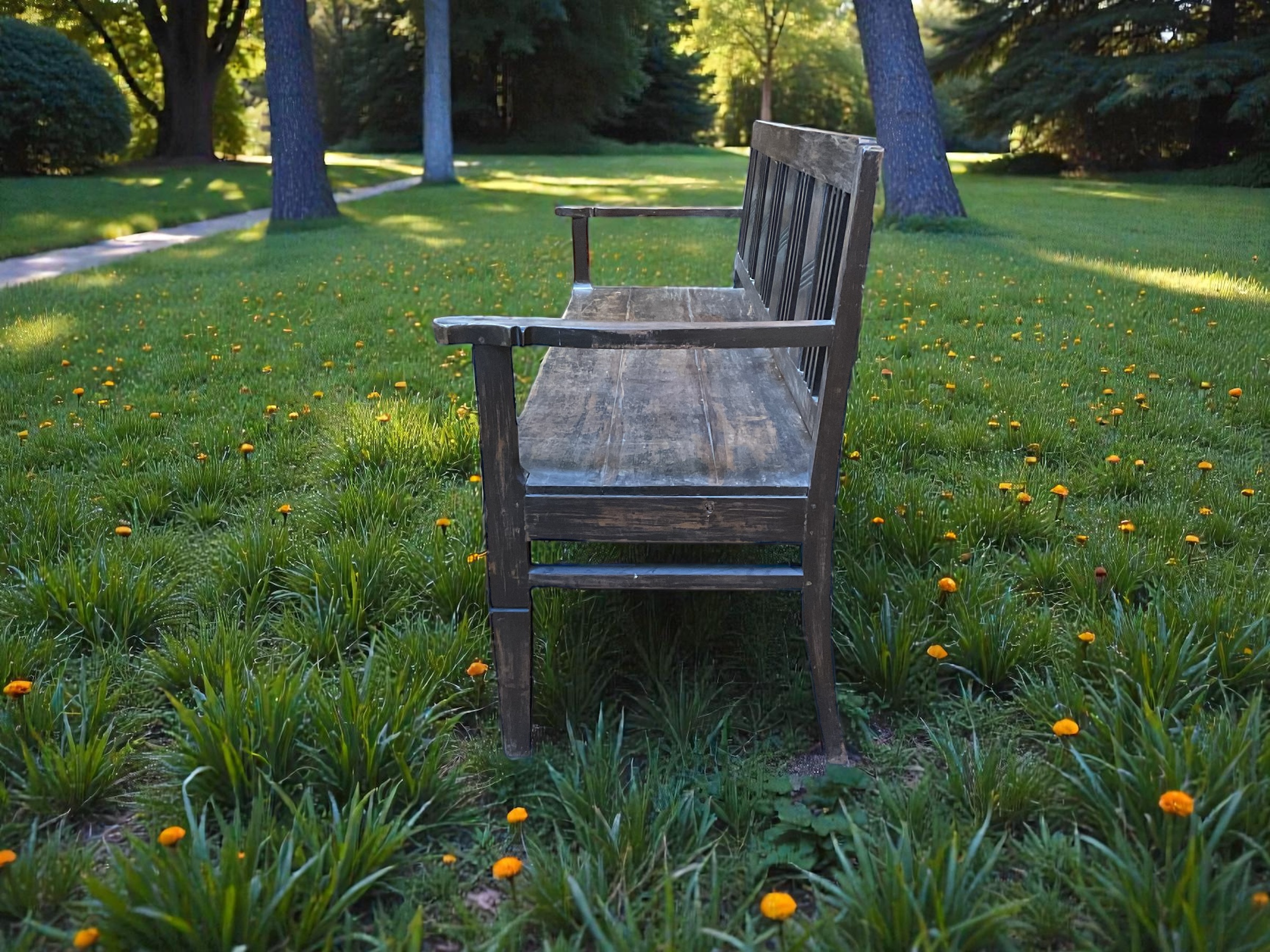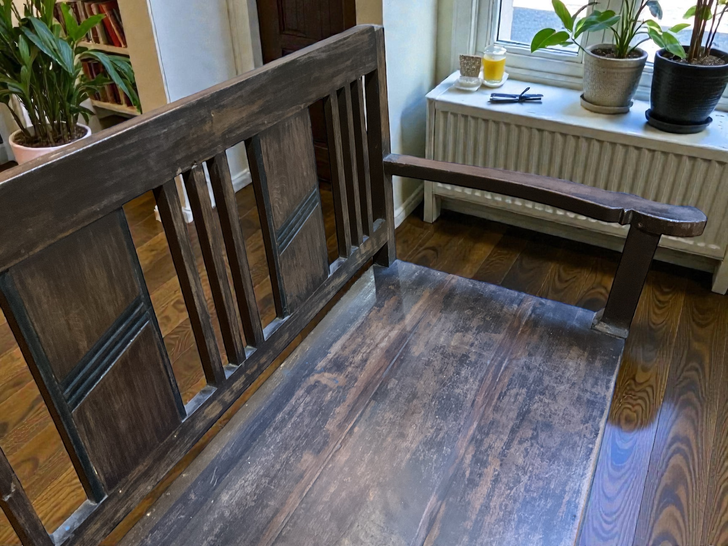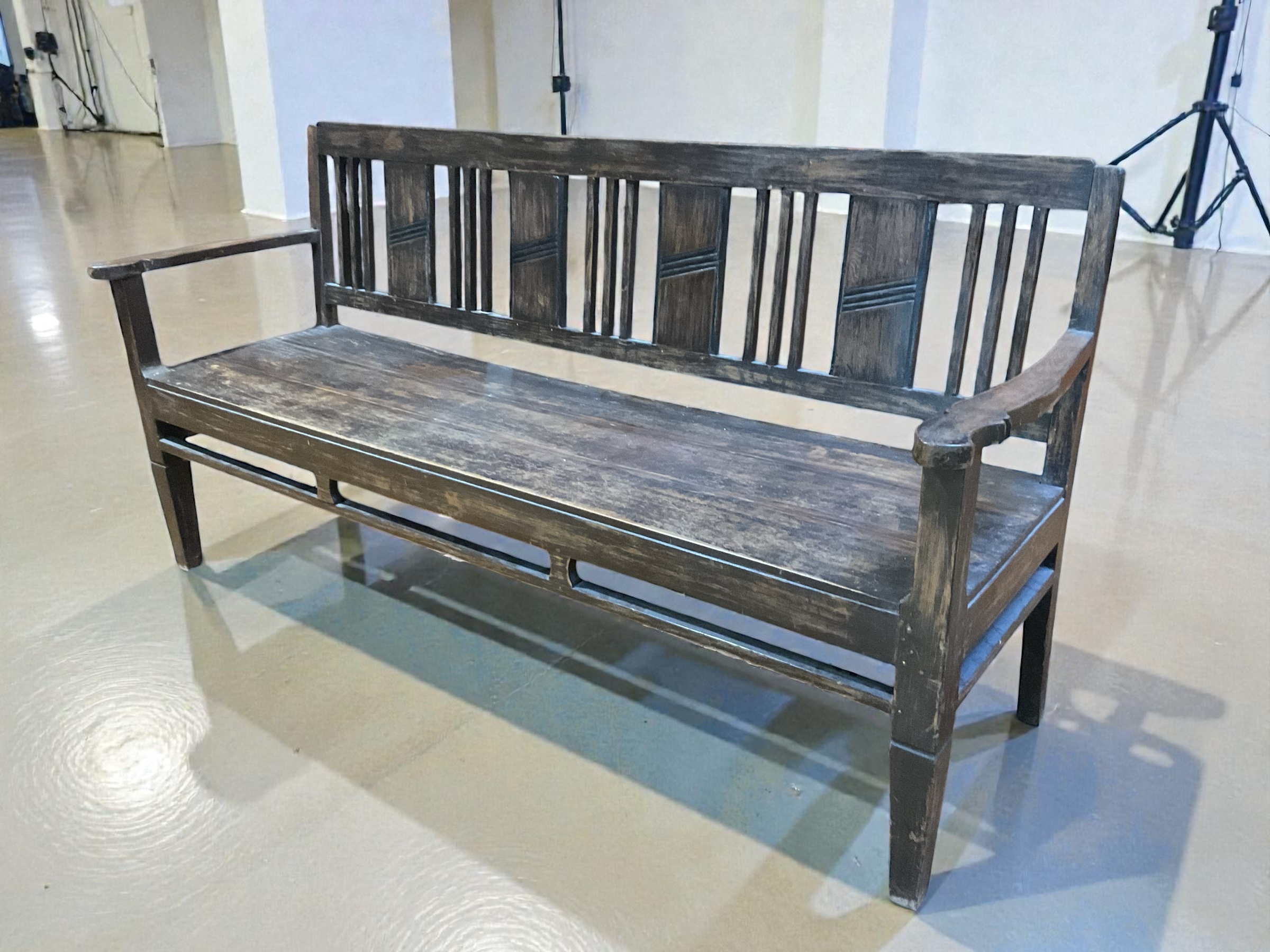 Dunkle Teakholz Bank für den Innen und Aussenbereich. Mit einem eleganten Jugendstil ähnlichem Look. Schön für einen Warteraum, Kanzlei, Ordination oder im privaten Heim.