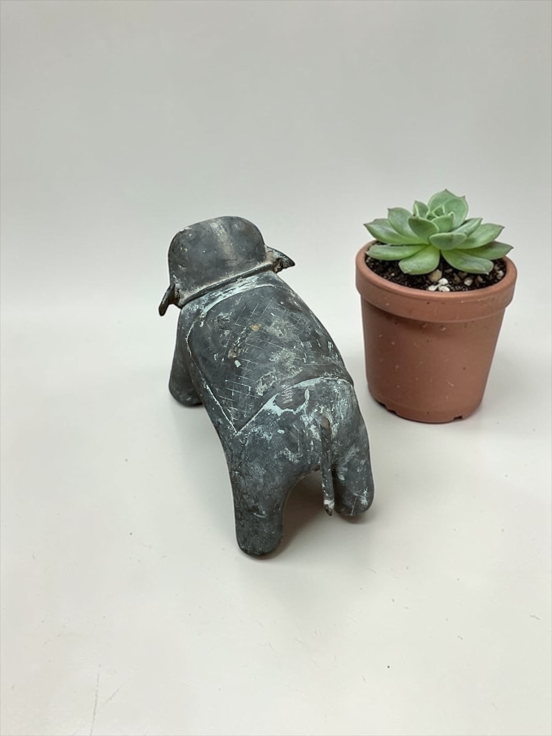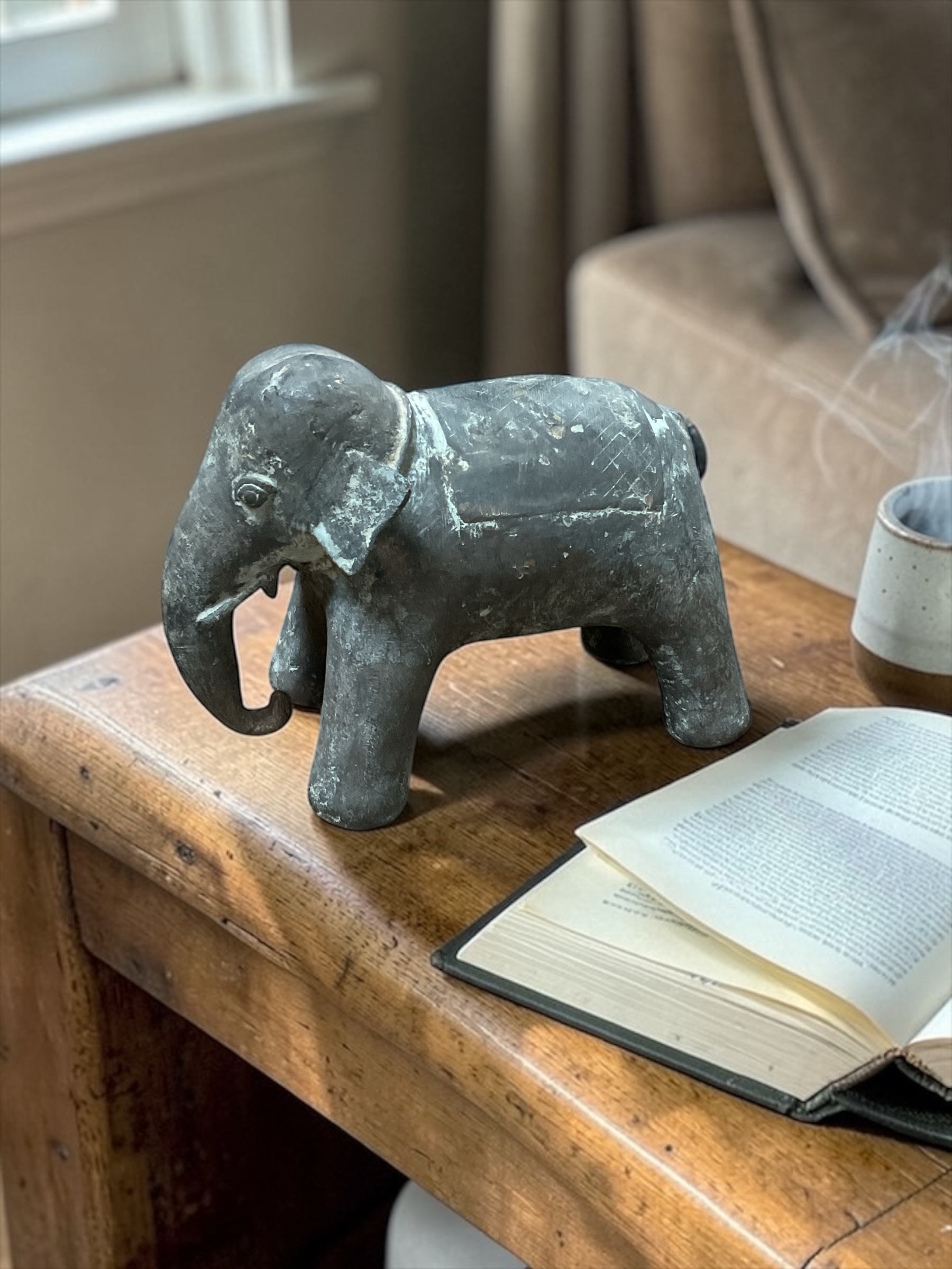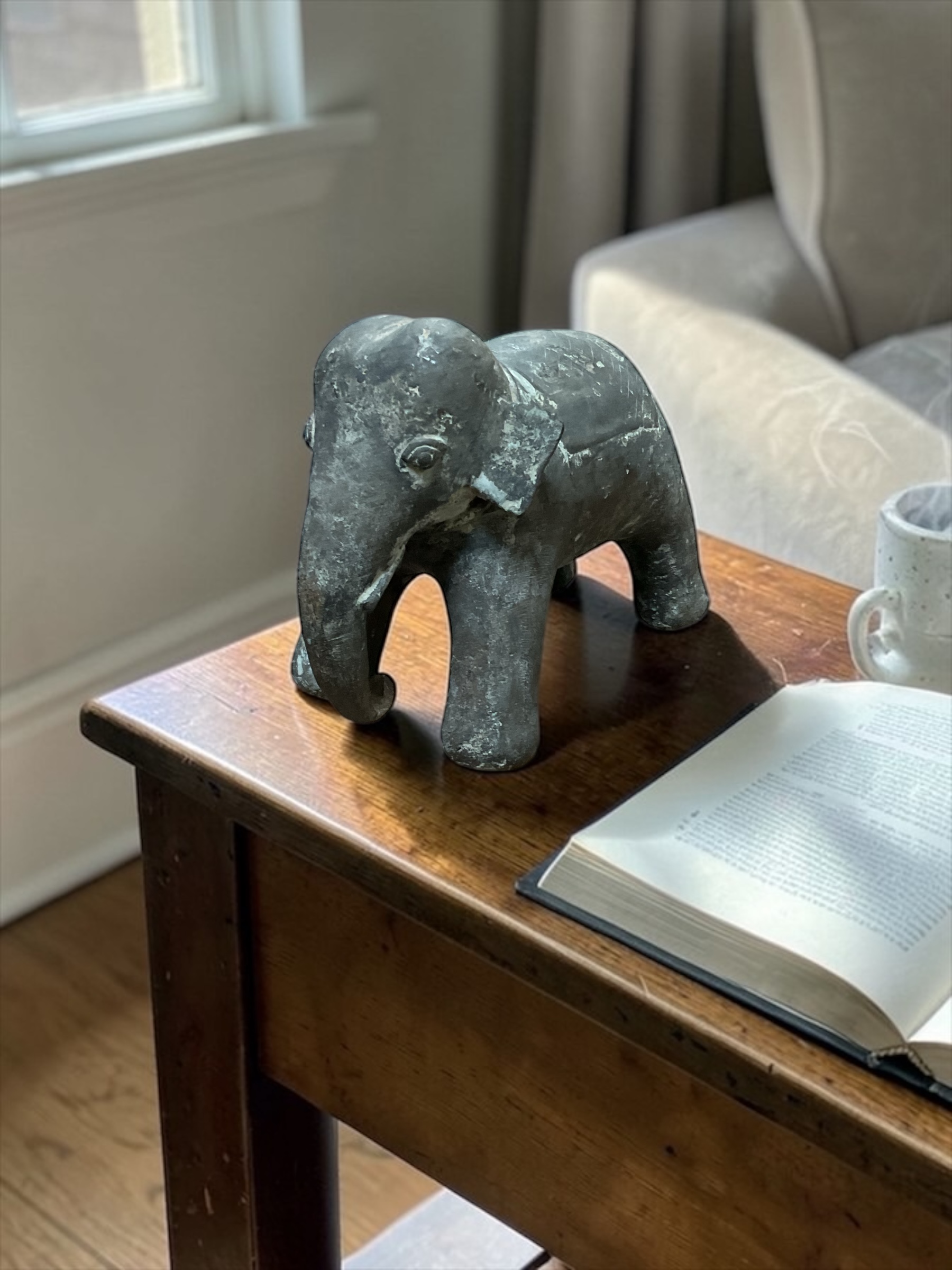 Schlichte Elefantenfigur aus Stein mit schöner natürlicher Patina und sichtbaren Gebrauchsspuren, die dem Stück einen authentischen Vintage-Charakter verleihen.