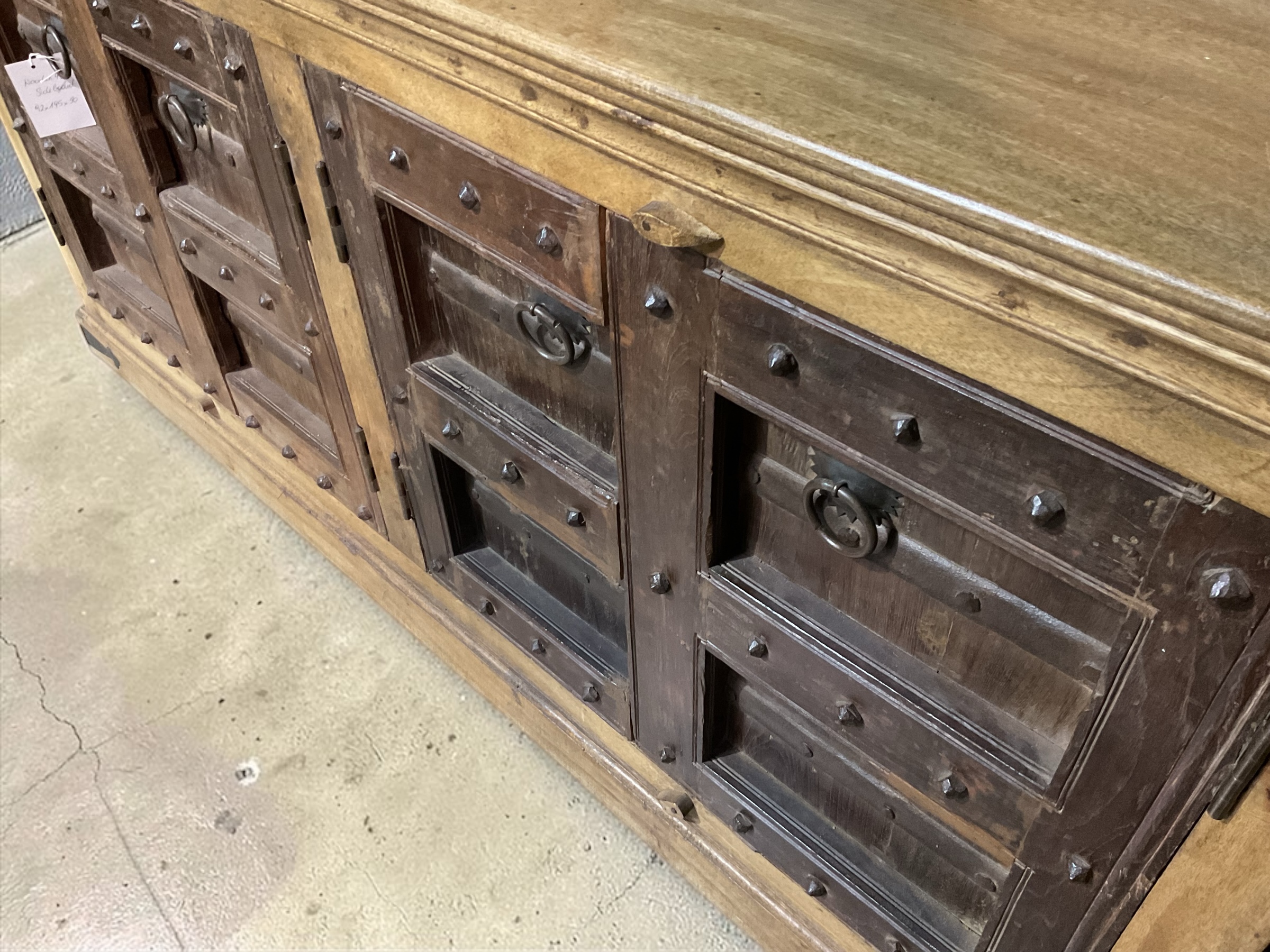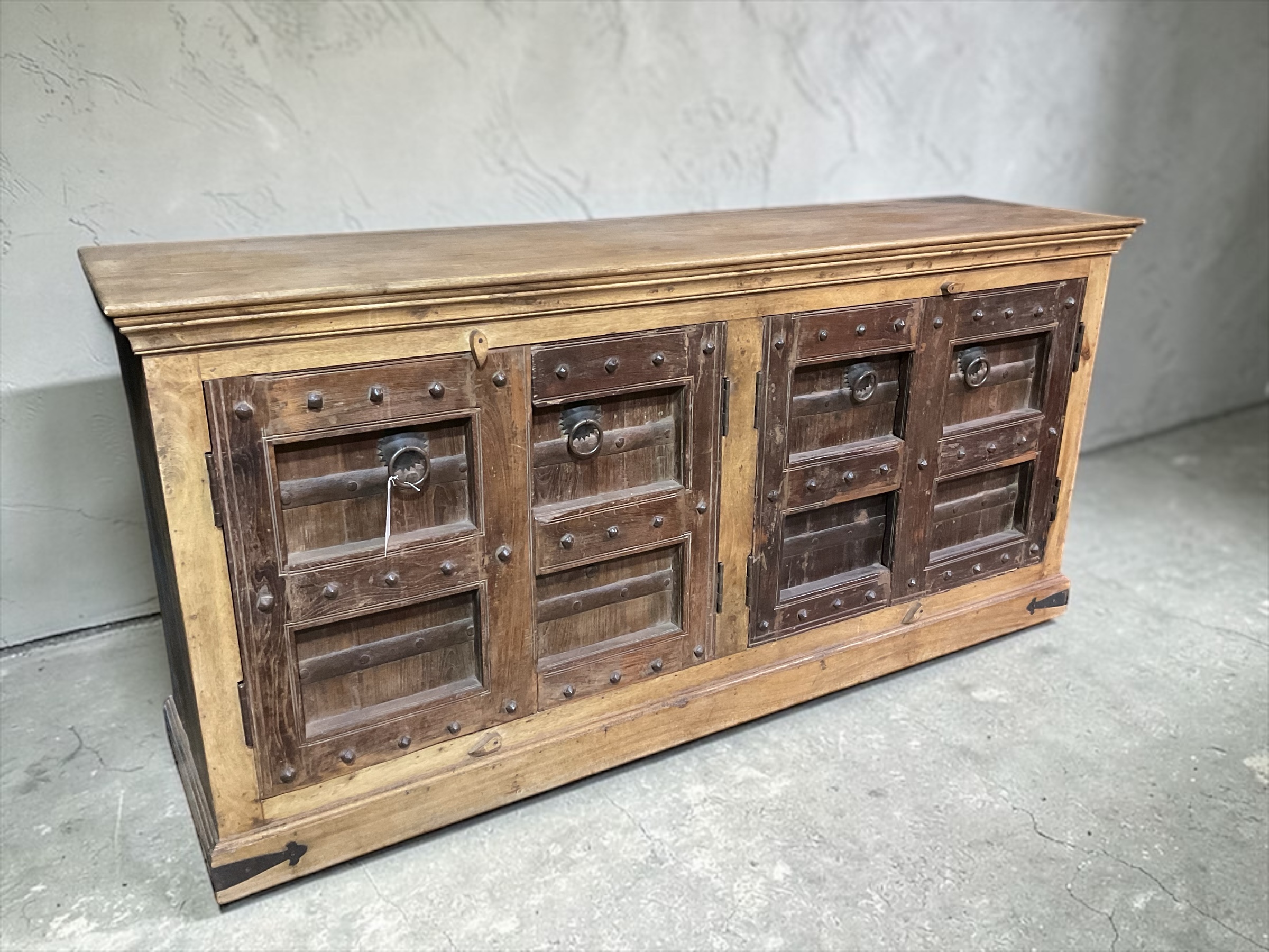 Außergewöhnliches Sideboard aus massivem Holz mit vier kunstvoll gestalteten Türen. Die dunkleren Fronten mit dekorativen Metallbeschlägen und Nieten verleihen dem Möbelstück einen markanten, rustikalen Charakter im Ethno- bzw. Kolonialstil.