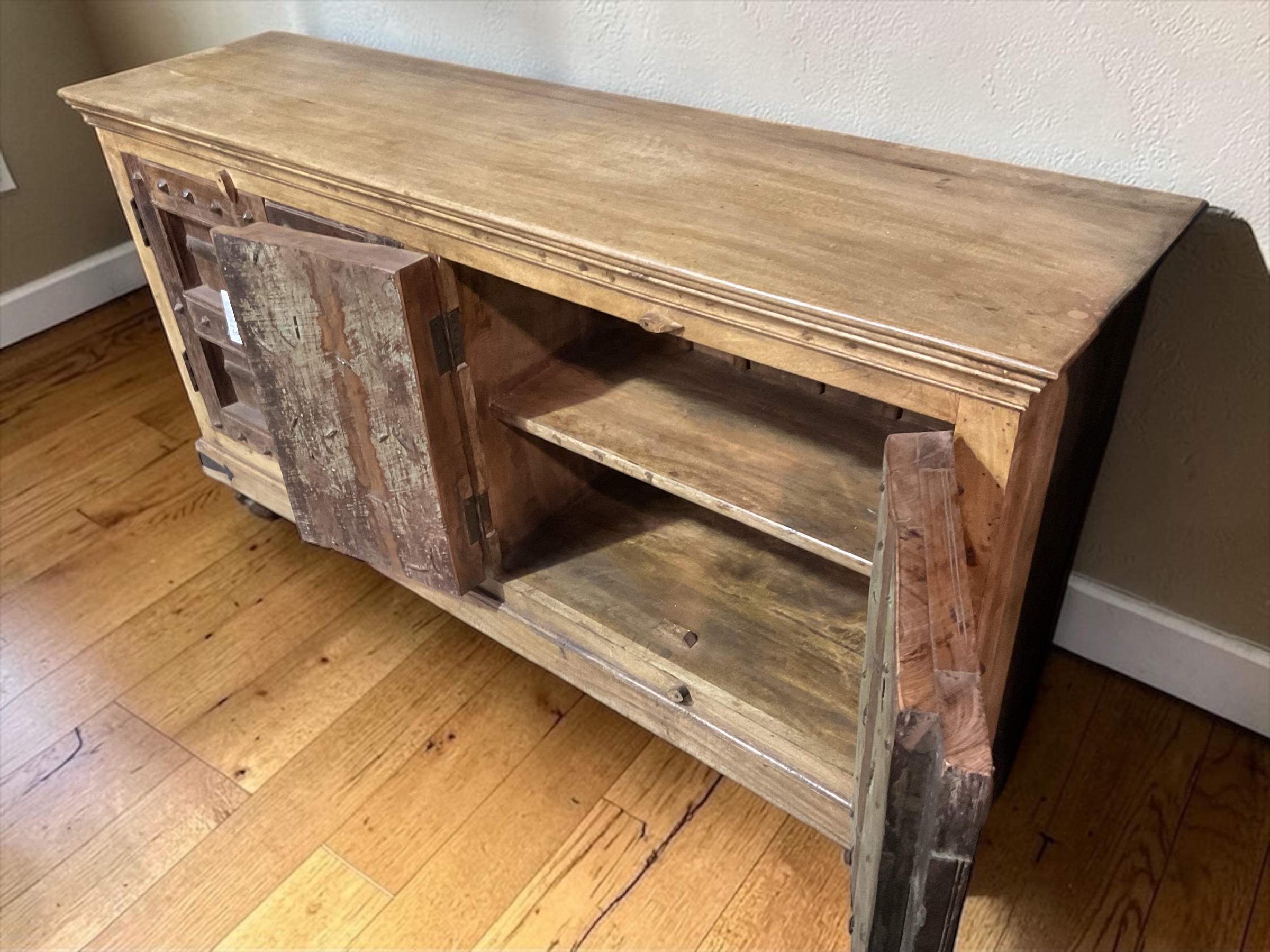 Im Inneren bietet das Lowboard praktischen Stauraum mit Einlegeböden – ideal für Wohnzimmer, Flur oder als TV-Möbel. Die sichtbaren Gebrauchsspuren unterstreichen den authentischen Vintage-Look und machen jedes Stück einzigartig.