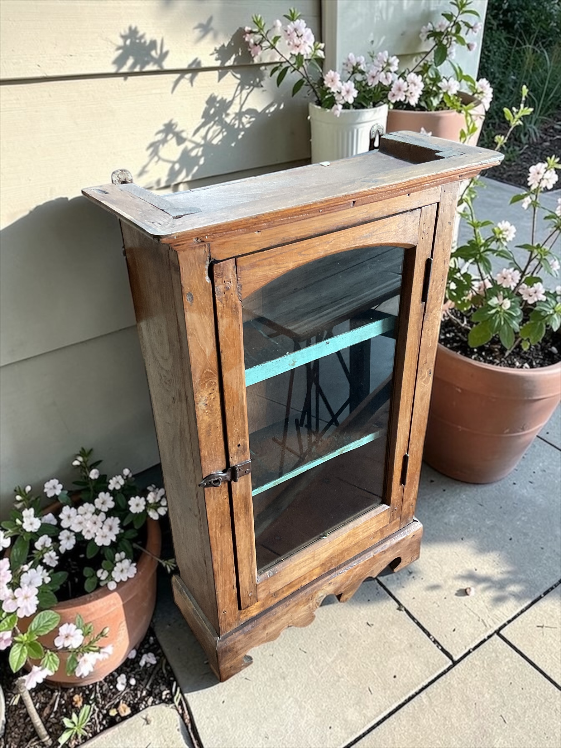 Vintage Wandschrank / kleine Holzvitrine mit Glastür