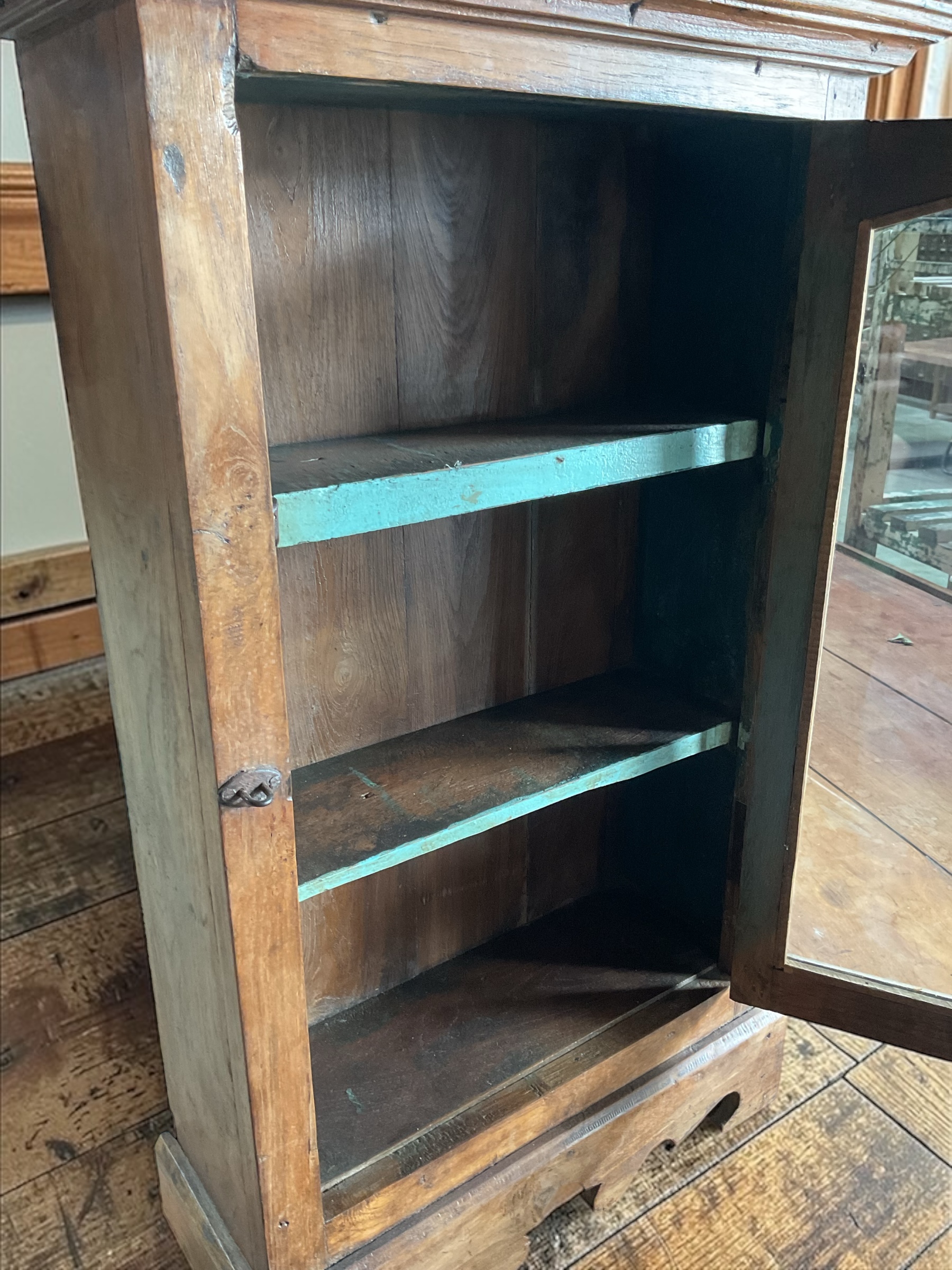 Charmanter kleiner Wandschrank aus Holz mit Glastür und dekorativ geschwungenem Sockel. Die drei Ablageflächen bieten Platz für Gläser, Gewürze, kleine Dekoration oder Badutensilien. Die leicht türkisfarben abgesetzten Regalböden verleihen dem Möbelstück einen besonderen Vintage-Charakter.